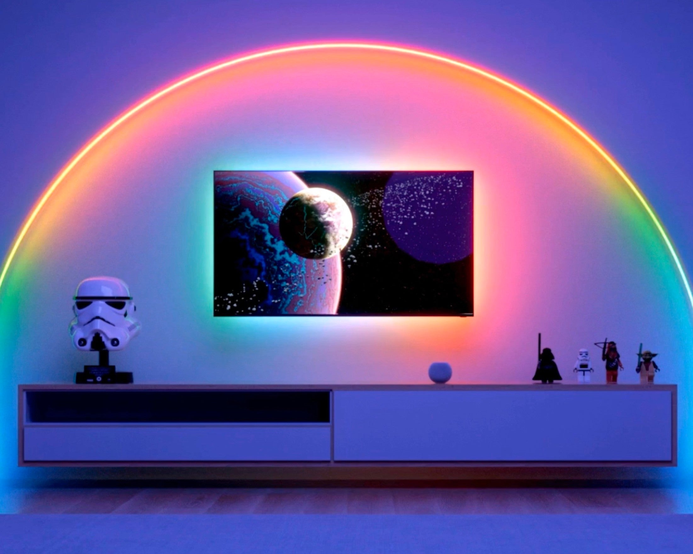 Add dynamic animated backlighting to your TV, desk, bed, shelves, and more for an elevated look that transforms your space.Create or choose palettes of single or multiple colours to flow gradually or pop up energetically to match any mood!